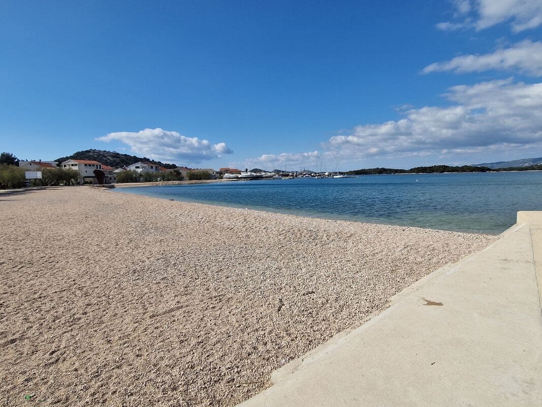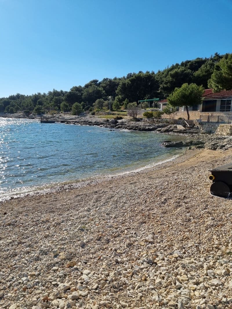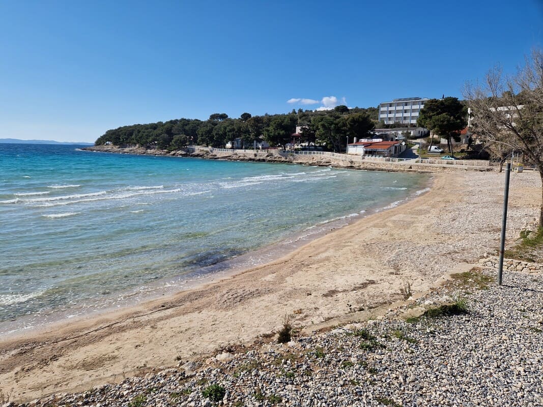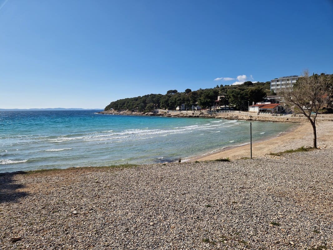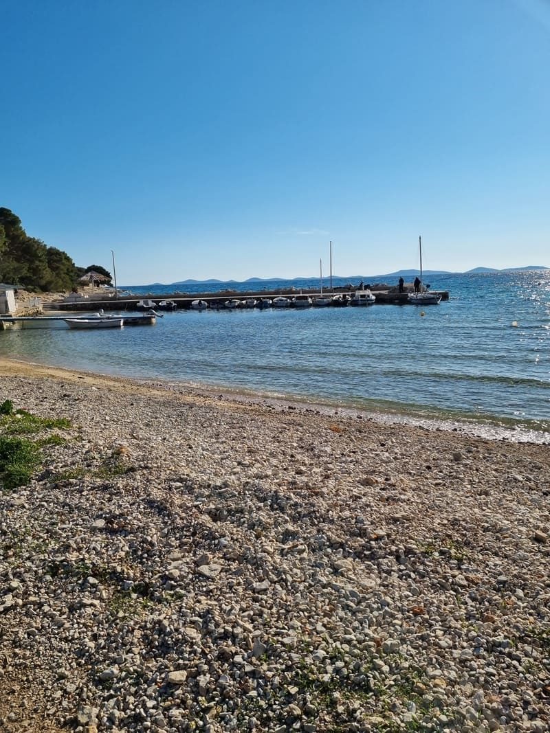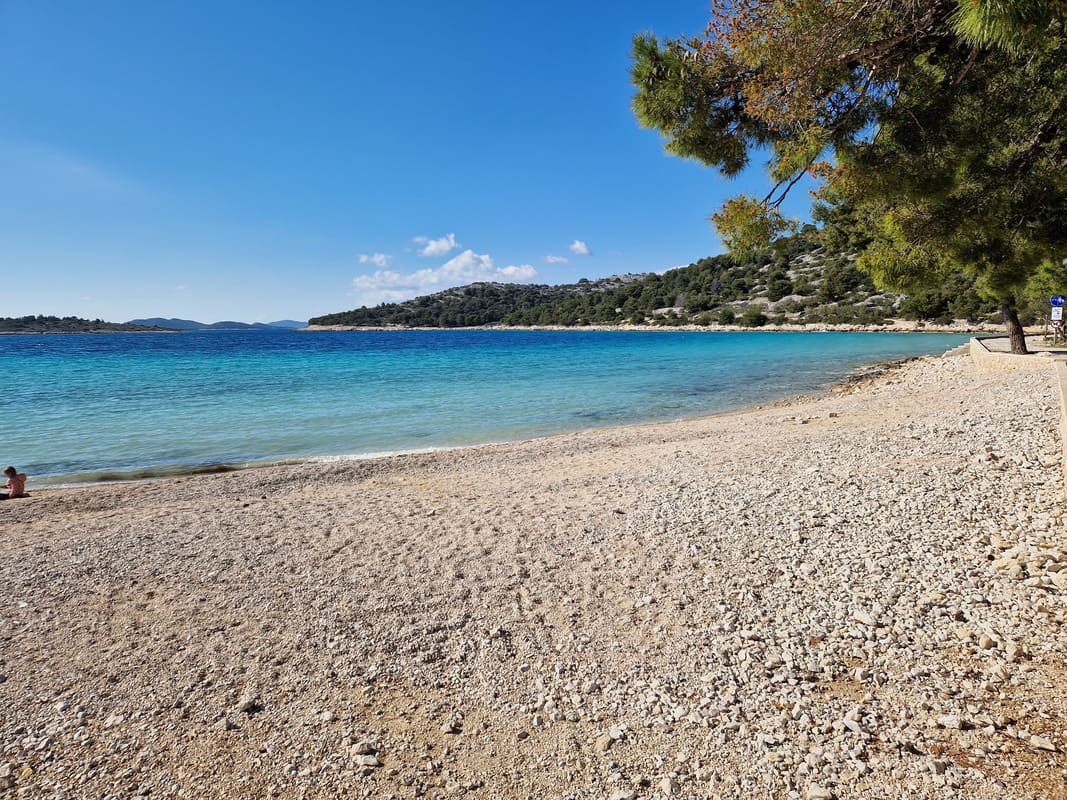 The beach is located in a small bay and has a pier. Swimming in the clear sea, unspoiled nature with plenty of shade and a well-kept beach. The beach is rocky on the side and in the middle part it consists of pebbles. The sandy part is in the minority. The shade on the beach is provided by mighty pine trees. From the beach you can admire the Kornati National Park. The beach is not located in a deep bay and is protected from waves and wind.