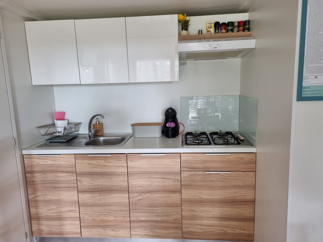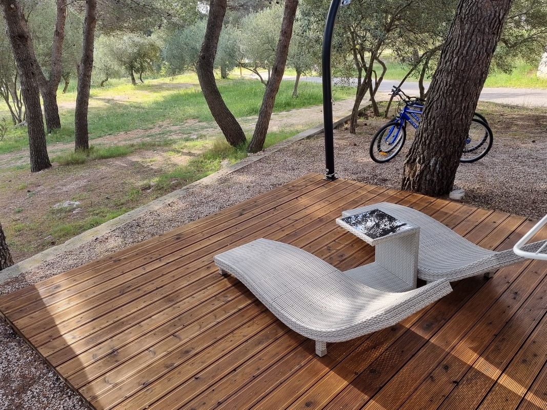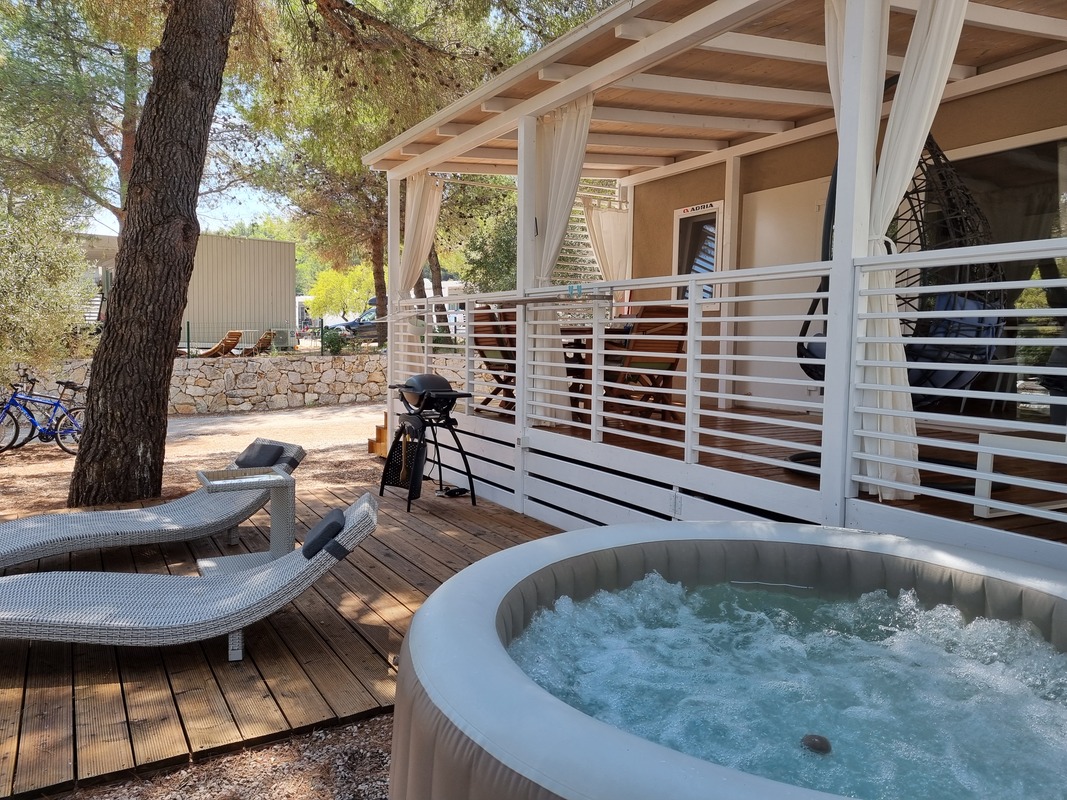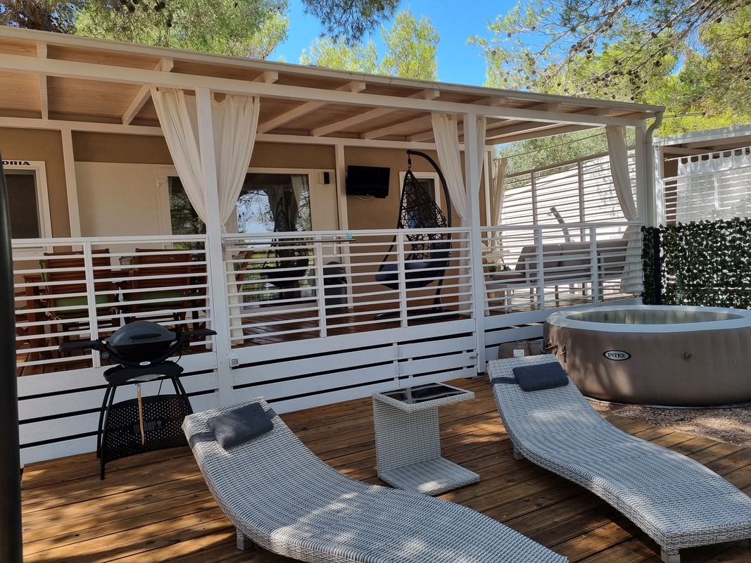Mobilna hiška je obkrožena z borovci, ki ji večno dneva zagotavljajo prijetno senco. Nahaja se v najbolj mirnem delu kampa, v hiški in okolici vam je na voljo tudi brezplačna WiFi povezava. Povsem zraven hiške je tudi brezplačni parkirni prostor za vaše vozilo. Najbližja plaža pa je oddaljena le nekaj minut hoje po senci (300 metrov).